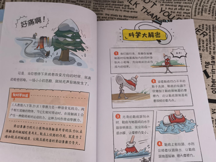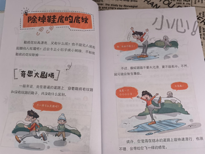 可是我也是沒想到他能在書中學會這么多的生活技巧,還會跟我說“如果是電線起火了,不能用水消滅;如果我們的鞋底沒有這種一橫一橫的紋路,就會變成滑冰鞋;磨刀的時候要加水,不然就變成火刀”等等一些奇怪的科普。我才認真看了這本書發現有很多生活的小科普,有趣有用。