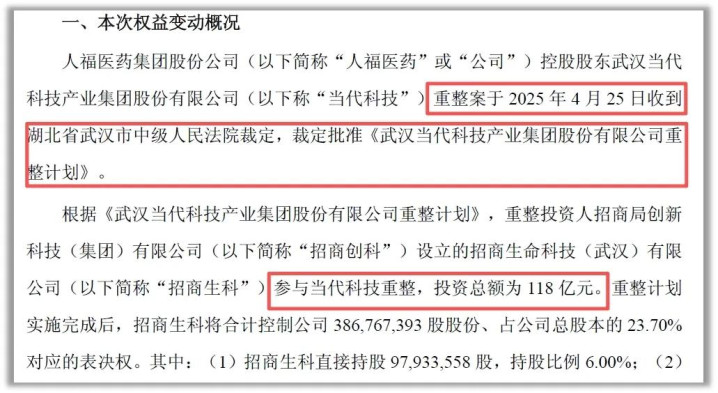 2025年6月28日,人福醫(yī)藥公告稱,招商科創(chuàng)參與了當代集團的重整,以118億元獲得了公司的控股權(quán)。