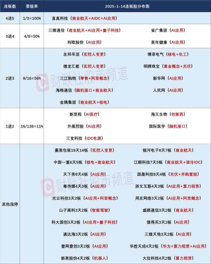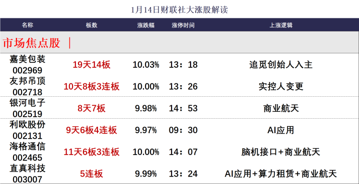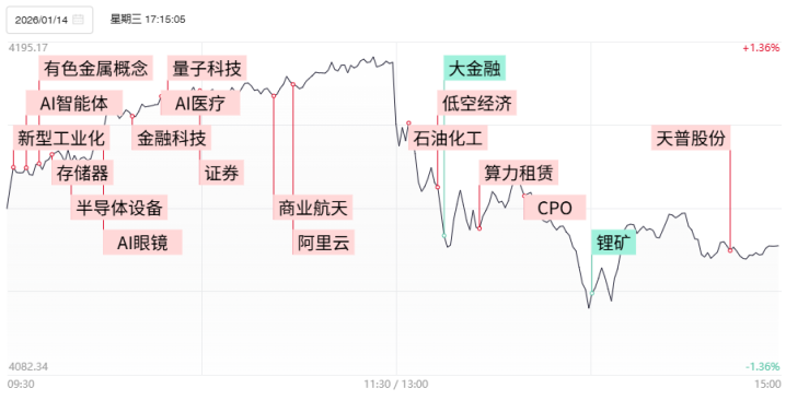 財聯(lián)社1月14日訊,今日102股漲停,59股炸板,封板率為63%,直真科技5連板,三維通信、省廣集團(tuán)、美年健康4連板,嘉美包裝19天14板,友邦吊頂10天8板,銀河電子8天7板,利歐股份9天6板,海格通信11天6板,北交所流金科技30cm3天2板,北交所七豐精工、美登科技30cm首板。市場沖高回落,滬指午后快速翻綠,此前一度漲超1%。滬深兩市成交額3.94萬億,較上一個交易日放量2904億,連續(xù)第3個交易日突破3.5萬億。盤面上,市場熱點(diǎn)快速輪動,全市場超2700只個股上漲。板塊方面,AI應(yīng)用、商業(yè)航天、半導(dǎo)體、算力租賃板塊領(lǐng)漲,保險、銀行、鋰電池等板塊領(lǐng)跌。截至收盤,滬指跌0.31%,深成指漲0.56%,創(chuàng)業(yè)板指漲0.82%。