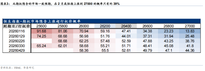 該券商還還指出,當(dāng)前市場(chǎng)隱含的恒指在1月底、2月底上漲到27000點(diǎn)的概率僅為25%和39%,存在明顯的正向預(yù)期差。這一情緒低點(diǎn)與A股市場(chǎng)形成鮮明對(duì)比,AH溢價(jià)指數(shù)已上升至122.7的階段高點(diǎn),顯示港股相對(duì)A股處于明顯低估狀態(tài)。