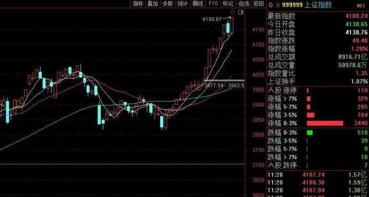 科創板和創業板大漲2.24%、3.71%,510300和563360兩只ETF也帶頭反彈,故使12個指數一片紅,收出中大陽線,大盤摸高4190點。4758只個股上漲,184只個股漲停,漲幅20cm的個股多達21家,市場震蕩上行的趨勢未變,做多激情仍在。