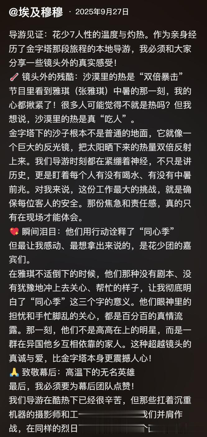 但旅游終究要畫上句點,當(dāng)《花兒與少年7》的嘉賓們繼續(xù)踏上旅途與穆穆和埃及道別后,本以為他們的緣分也將終結(jié)于此,在導(dǎo)游穆穆的社交平臺賬號下,他用心寫的一篇博文“導(dǎo)游見證:花少7人性的溫度與灼熱”仿佛也是在為這段緣分畫終結(jié)符。
