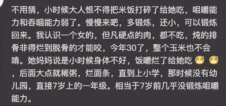 現在的年輕父母帶孩子特別細致,給孩子做輔食講究沒有顆粒、少放鹽分、多加蛋白質,看起來就像高級餐廳里的菜,孩子從六個月大開始吃糊狀食物,一直到四五歲還在吃軟爛的東西,嘴巴的肌肉得不到鍛煉,老一輩人隨手遞個蘋果或排骨讓孩子啃,孩子雖然咬起來費勁,但慢慢就練出了咀嚼能力,這種做法不是粗糙,而是自然的鍛煉方式。