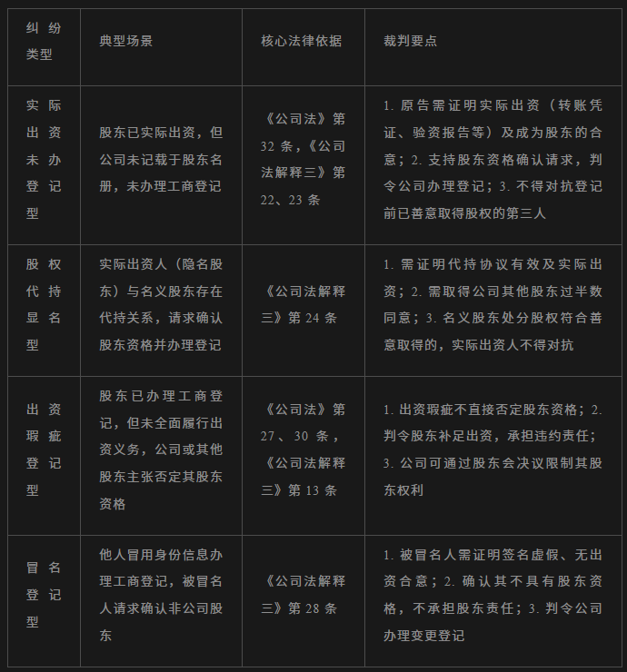 結(jié)合彭萬(wàn)鐵案反映的司法實(shí)踐,股東資格確認(rèn)糾紛主要可分為四類(lèi)典型情形,其裁判規(guī)則各有側(cè)重,具體如下表所示: